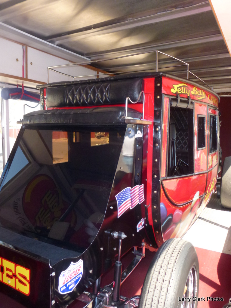 They said Jelly Belly and Lucas Oil are their two sponsors and they have been making a living this way for the past 36 years. He performs the work on the coach and also is the driver. When he gets the coach around 100mph he controls it by levers on both sides that make it run straight and true.